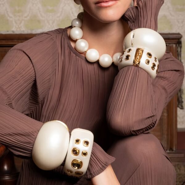 BRACELETE DE RESINA COM CRISTAL PIGMENTO DOURADO E PÉROLA – NÁDIA GIMENES