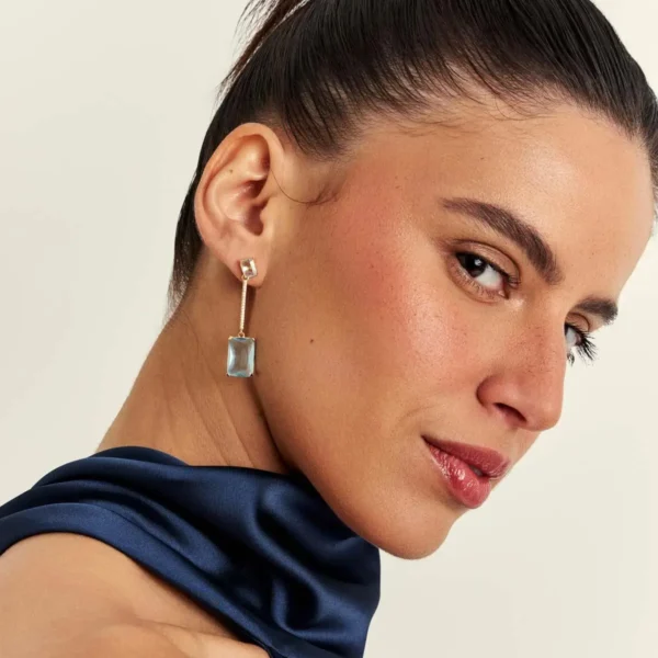 Brinco pêndulo banhado a ouro composto por cristais retangulares com laterais vazadas e zircônias, que proporcionam um toque de brilho e delicadeza. Design sofisticado, perfeito para valorizar seu visual com elegância e estilo.