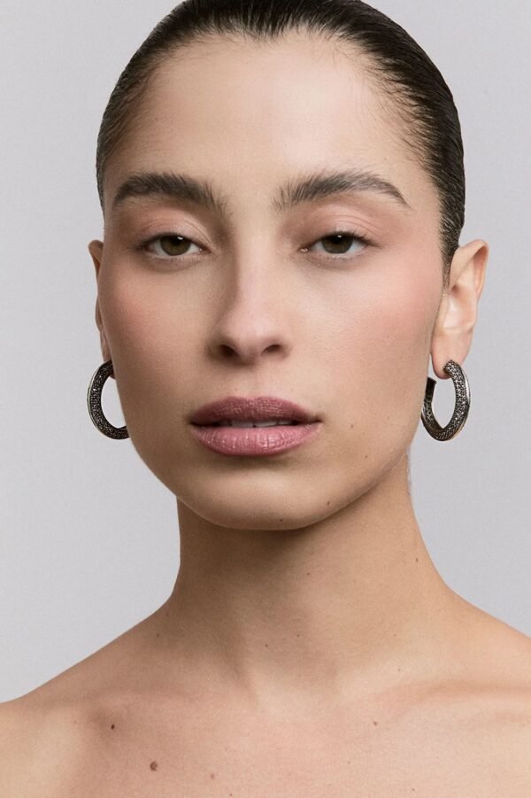 O Brinco Argola Vela foi produzido artesanalmente, aplicando as técnicas da joalheria, no banho Prata Boho, com 284 cristais Strass Black Diamond cravejados manualmente. Tamanho 3,30 cm x 3,30 cm