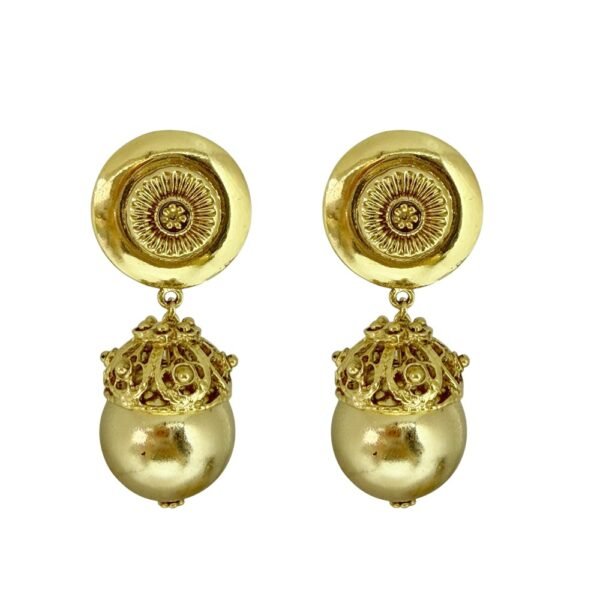 Brinco dourado com base lisa e pingente esférico detalhado — clássico e elegante!