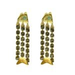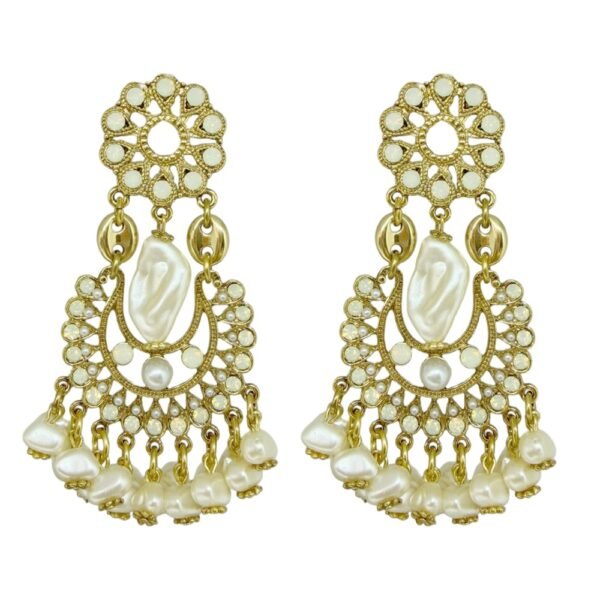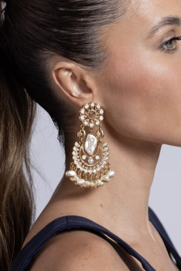 Brinco dourado com pérolas e detalhes rendados.